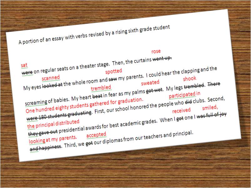 First, the student identifies the verbs used in the piece of writing, and lists them with tally marks to show how often the student used them. To revise, we start with some easy words to replace, such as get, go, do, make and take. The verbs are already encircled with color in the essay, so it is easy to find one of those words. The student reads the sentence aloud, and I ask if he can think of any word to replace the weak verb.