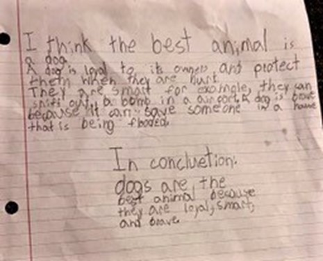 The other night I received a call from a father whose second-grade son needed to write an essay on his favorite animal. The child didn’t know what to do. I asked the boy on the phone what his favorite animal is. “Dogs,” he said, not a surprising answer since the boy has grown up with pet dogs. I asked him why, and he identified several reasons. I told him he needed to explain his reasons. He told me that without problem.